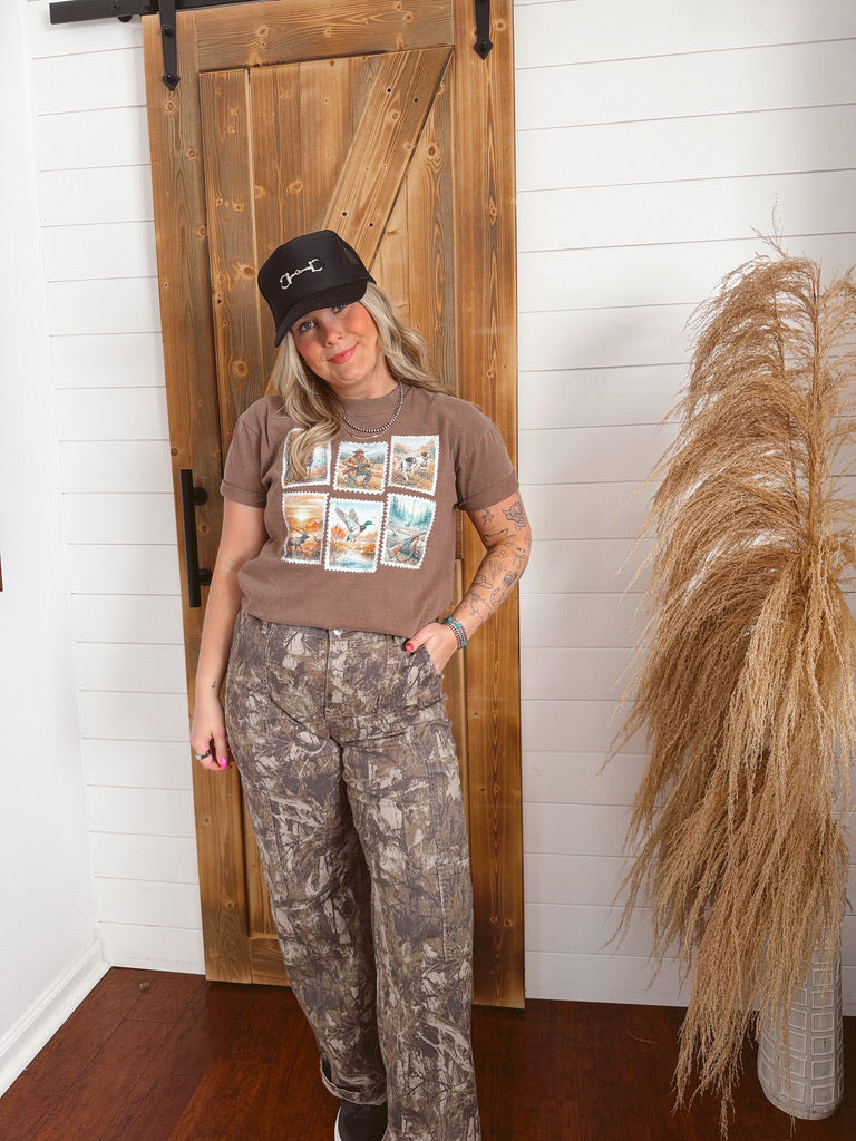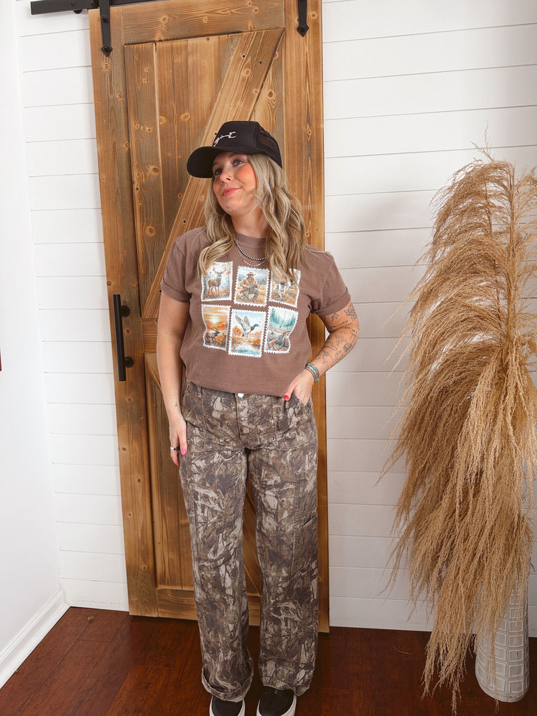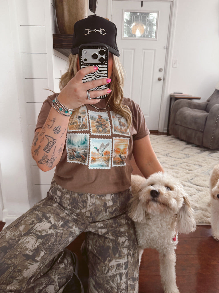 Hunter Stamp Collage, by Walking A provides a unisex fit on a mocha tee or crew.